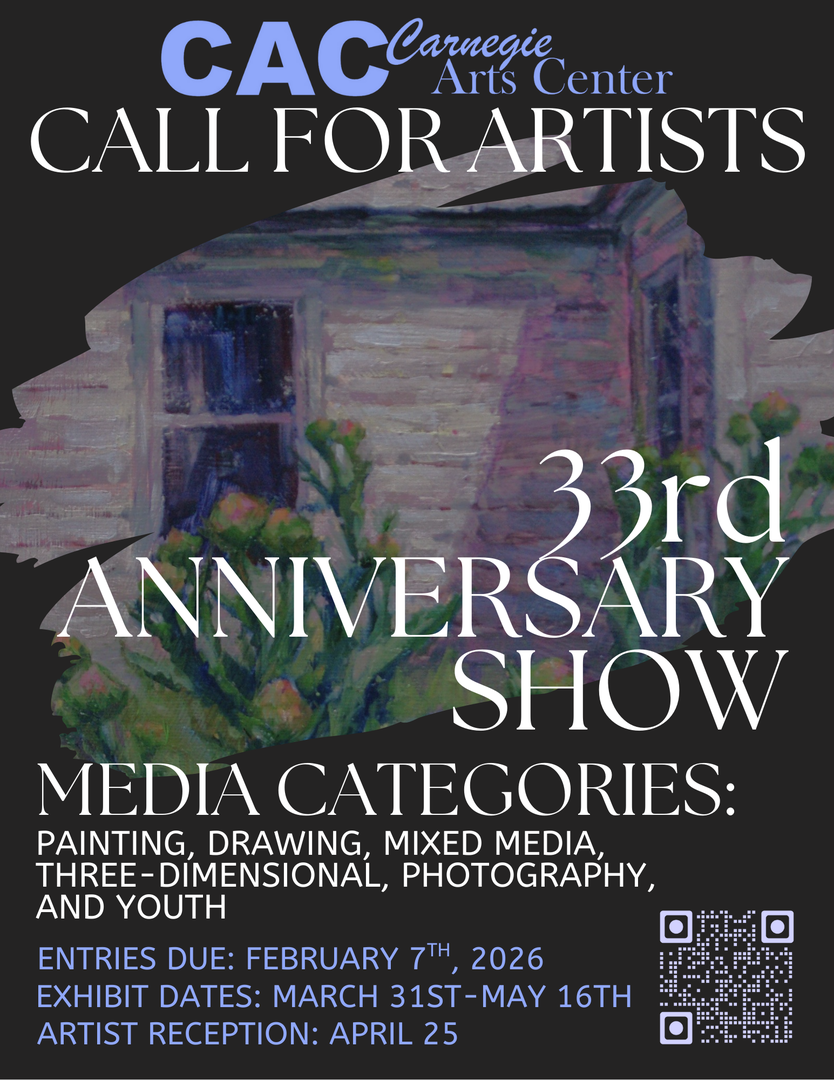Sale of artwork is encouraged. Carnegie Arts Center retains 35% commission on all sales directly related to the show. Please price all pieces to include this commission. The Carnegie is not liable if