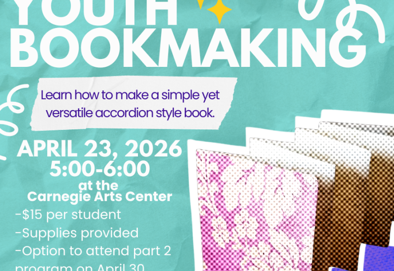 The Carnegie is excited to offer a beginner friendly book making class for the youth of the community! In honor of National Poetry Month, we will be learning to make an accordion book as well as exploring writing some poems that will be put into our finished books. This class is suited to all ages (but we ask that children 6 and under be accompanied by an adult). The cost for this workshop is $15 and covers all materials as well as snacks/refreshments. To sign up, select one of the links below or call us at 762-4571.